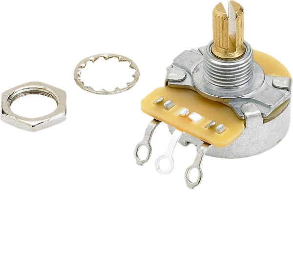 500K potentiometer (commonly associated with humbucking pickups) with 3/8" solid shank, for use as a volume or tone control on almost all US and Mexican made Fender instruments with solid shank pot...