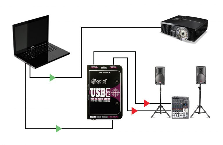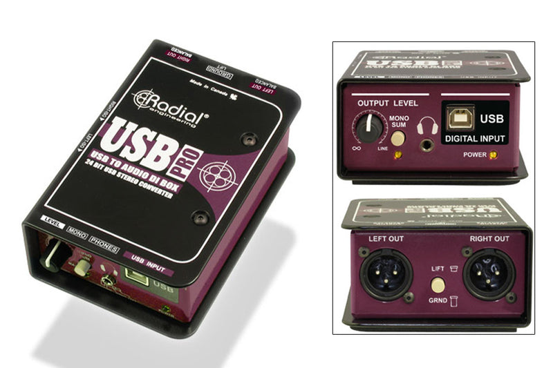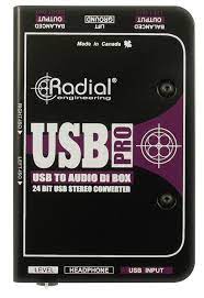 Radial's USB-Pro is a high-resolution stereo direct box designed to collect audio signals directly from a computer's USB port and transfer them to a pair of balanced audio outputs to feed a mixing console , a recorder or a sound system.